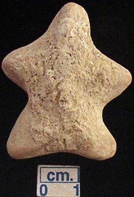 | Description / विवरण | A star shape archaic terracotta human figurine with small head, red, pinched nose, pin hole eyes, slit mouth, short out stretched arms, short wide bridged stumpy legs, treated with red wash, handmade. |