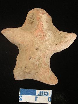| Description / विवरण | A star shaped archaic terracotta male figurine with round head, pin hole eyes, pinched nose, slit open mouth, short out stretched stumpy arms, pin hole navel, short wide bridged stumpy legs, phallus indicated, treated with red wash. |