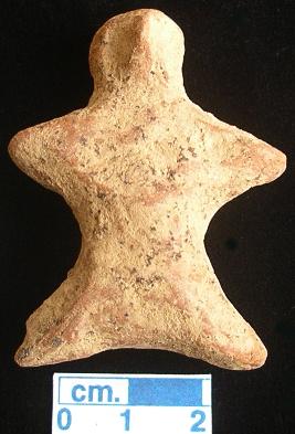| Description / विवरण | A terracotta archaic human figurine with round head, red colour, pinched nose, short out stretched stumpy pointed arms, short wide bridged stumpy legs, treated with red wash, handmade. |