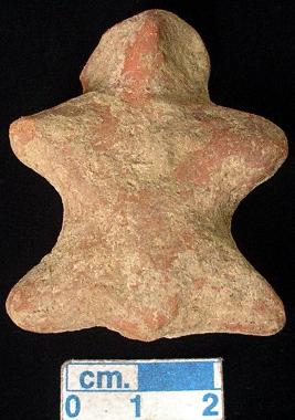 | Description / विवरण | A terracotta archaic male figurine with round head, red colour, pinched nose, short out stretched arms, short wide stumpy legs, phallus indicated, treated with red wash, handmade. |