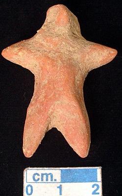 | Description / विवरण | A terracotta archaic human figurine with round head, red colour, pinched nose, short out stretched arms, short wide bridged stumpy legs, treated with red wash, handmade. |