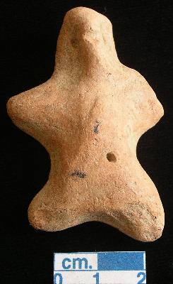 | Description / विवरण | A terracotta archaic human figurine with short head, pin hole eyes, pinched nose, and mouth, short out stretched stumpy right arm but left is broken, punched navel, short wide bridged stumpy legs, red color. |