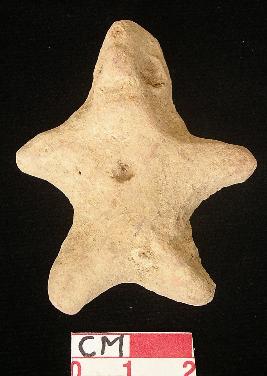 | Description / विवरण | A star shaped terracotta archaic human figurine, with round head, red, hand made, deep pin hole eyes, pinched nose, open slit mouth, short out stretched stumpy arms, deep pin hole navel, short wide bridged stumpy legs. |