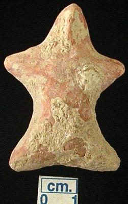 | Description / विवरण | An archaic terracotta human figurine with round head, red, pinched nose, pin hole eyes, slit mouth, short out stretched arms, shrot wide bridged stumpy legs, treated with red wash, handmade. |