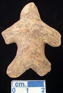 | Description / विवरण | An archaic human terracotta figurine with round head, red, pinched nose, pin hole eyes, slit mouth, short out stretched arms, shrot wide bridged stumpy legs, punched navel, handmade. |