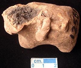 | Description / विवरण | Fragment of a terracotta animal figurine, probably an elephant figurine, dull red in colour, broken trunk, right ear damaged saddle made with applique technique, knotty body, left fore and hind legs are partly damaged. |