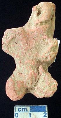 | Description / विवरण | A terracotta archaic human figurine with round head, punched eyes, pinched nose, slit open mouth, short out stretched arms, short wide bridged legs, bears applique bag on back and treated with red wash, handmade. |