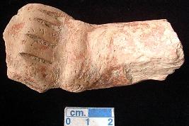 | Description / विवरण | Fragment of a terracotta human leg, red in colour and treated with red slip which is being pealed off, flat sole, fingers made with deep incised lines, bears anklet, broken from knee. |