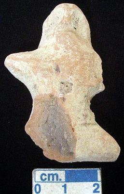| Description / विवरण | An archaic human terracotta figurine with round head, red, pinched nose, pin hole eyes, slit mouth, short out stretched arm but left is damaged, shrot wide bridged stumpy legs but right leg is damaged, punched navel, handmade. |