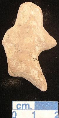 | Description / विवरण | Badly damaged thin and little archaic human figurine, rubbed, notacial organs, only left out stretched arm and leg with pointed ends, right arm and leg is fully vanished, greyish in colour. |