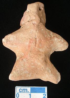 | Description / विवरण | A archaic human terracotta figurine with rounded head, red, slit mouth, pinched nose, short out stretched arms with two incised line in each, shrot wide bridged stumpy legs, punched eyes, punched navel, handmade. |