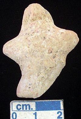 | Description / विवरण | An archaic human terracotta figurine with round head, red, pinched nose, pin hole eyes, slit mouth, short out stretched arms, lower portion is damaged, punched navel, handmade. |