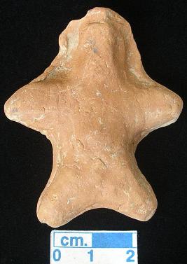 | Description / विवरण | A archaic human terracotta figurine with rounded head, red, slit mouth, pinched nose, short out stretched arms with two incised line in each, shrot wide bridged stumpy legs, punched eyes, punched navel, handmade. |