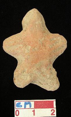 | Description / विवरण | A star shaped terracotta archaic human figurine, with round head, red, hand made, pinched nose, open slit mouth, short out stretched stumpy arms with three incised lines in each, punched navel, short wide bridged stumpy legs with three incised lines in each, treated with red wash. |