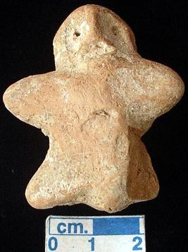 | Description / विवरण | A terracotta archaic human figurine with round head, red, pin hole eyes, pinched nose, open slit mouth, short out stretched arms , both short legs are joined each other but the left one is slightly broken, phallus indicated, treated with red wash, handmade. |
