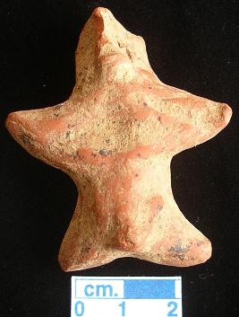 | Description / विवरण | An archaic male terracotta figurine, red, pinched nose, split mouth, short out stretched arms with one incised line in each , shrot wide bridged stumpy legs, punched eyes, punched navel, phallus indicate, handmade. |