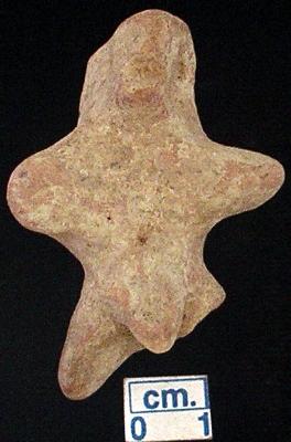 | Description / विवरण | An archaic terracotta male figurine, red, pinched nose, pin hole eyes, slit mouth, short out stretched arms, shrot wide bridged stumpy legs and left leg is broken, phallus indicated, treated with red wash, handmade. |
