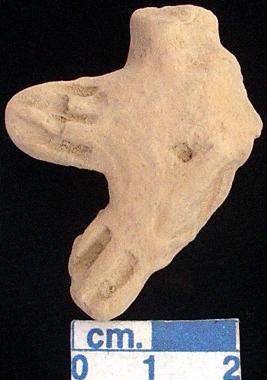 | Description / विवरण | A terracotta archaic human figurine with broken head, red, short out stretched arms with three incised lines but the left one is broken, punched navel, short wide bridged legs with two incised lines but the left one is broken, treated with red wash, handmade. |
