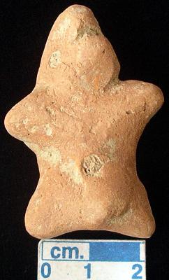 | Description / विवरण | A terracotta archaic human figurine with round head, red, punched eyes, pinched nose, open slit mouth, short out stretched arms , punched navel, both short legs are joined each other, phallus indicated, treated with red wash, handmade. |