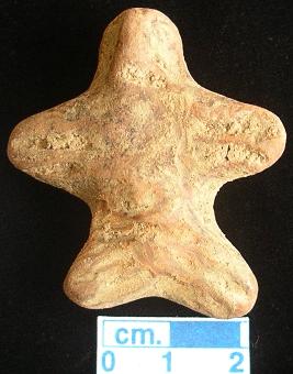 | Description / विवरण | An archaic human terracotta figurine, red, pinched nose, slit mouth, short out stretched arms with two incised line in each, shrot wide bridged stumpy legs with two incised line in each, punched eyes, handmade. |