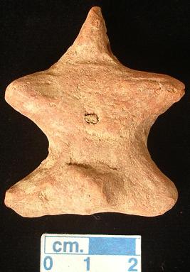 | Description / विवरण | A terracotta archaic human figurine, punched eyes, red, pinched nose, open mouth, short out stretched arms, pin hole navel, both short legs are joined each other , phallus indicated, treated with red wash, handmade. |