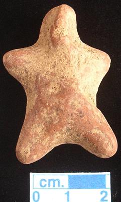 | Description / विवरण | An archaic human terracotta figurine, red, pinched nose, slit mouth, short out stretched arms, shrot wide bridged stumpy legs, punched eyes, handmade. |