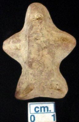 | Description / विवरण | An archaic terracotta human figurine with round head, red, pinched nose, pin hole eyes, slit mouth, short out stretched arms with one incised line in each, shrot wide bridged stumpy legs with one incised line in each, treated with red wash, handmade. |