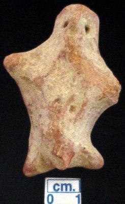 | Description / विवरण | An archaic terracotta human figurine with round head, red, pinched nose, pin hole eyes, slit mouth, short out stretched arms and some damaged, shrot wide bridged stumpy legs, phallus inidicated, treated with red wash, handmade. |