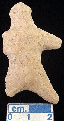 | Description / विवरण | An archaic terracotta human figurine with small head, red, pinched nose, short out stretched arms but the right one is broken, short wide bridged stumpy legs but the right one is broken, treated with red wash, handmade. |