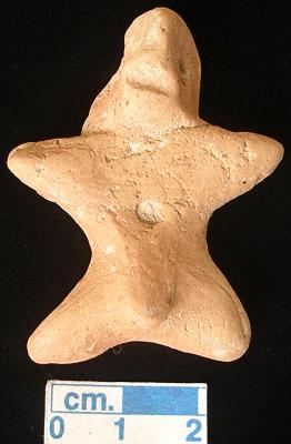 | Description / विवरण | An archaic male terracotta figurine, red, pinched nose, short out stretched arms, shrot wide bridged stumpy legs, punched eyes, punched navel, phallus indicated, handmade. |