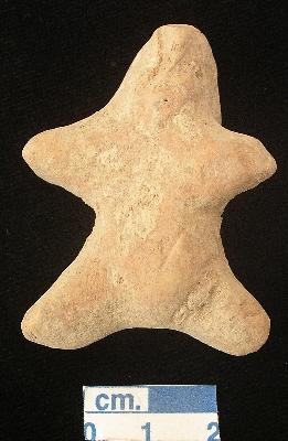 | Description / विवरण | A star shaped terracotta archaic human figurine, with round head, red, hand made, pin hole eyes, pinched nose, open slit mouth, short out stretched stumpy arms, short wide bridged stumpy legs treated with red wash. |