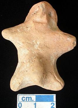 | Description / विवरण | An archaic male terracotta figurine with rounded head, red, pinched nose, short out stretched arms, shrot wide bridged stumpy legs, punched eyes, punched navel, phallus indicated, handmade. |