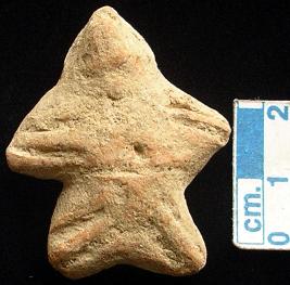 | Description / विवरण | An archaic human terracotta figurine, red, pinched nose, slit mouth, short out stretched arms with two incised line in each, short wide bridged stumpy legs with two incised line in each, punched eyes, punched navel, handmade. |