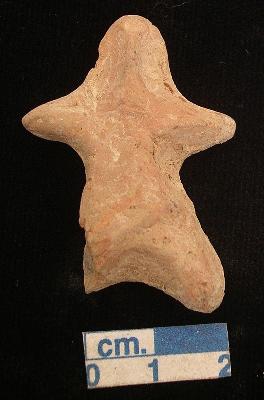 | Description / विवरण | A star shaped terracotta archaic human figurine with round head, punched eyes, pinched nose and mouth, short out stretched stumpy arms, short wide bridged stumpy left leg and right is broken, red colour. |