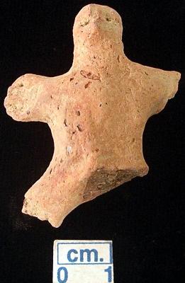 | Description / विवरण | A terracotta archaic human figurine with small head, red, pinched nose, short out stretched arms with thrwee incised lines but left one is broken, short wide bridged stumpy legs but the left one is broken, treated with red wash, handmade. |