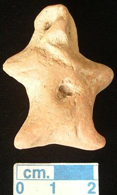 | Description / विवरण | An archaic human terracotta figurine, red, pinched nose, slit mouth, short out stretched arms, shrot wide bridged stumpy legs, punched eyes, punched navel, handmade. |