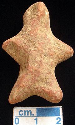| Description / विवरण | An small archaic human terracotta figurine, red, pinched nose, slit mouth, short out stretched arms, short wide bridged stumpy legs, punched eyes, punched navel, handmade. |