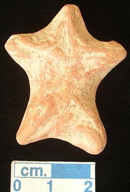 | Description / विवरण | An archaic human terracotta figurine, red, pinched nose, short out stretched arm, , short wide bridged stumpy legs, punched eyes, punched navel, handmade. |