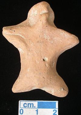 | Description / विवरण | An archaic human terracotta figurine, red, pinched nose, short out stretched arm, , short wide bridged stumpy legs, punched eyes, punched navel, handmade. |
