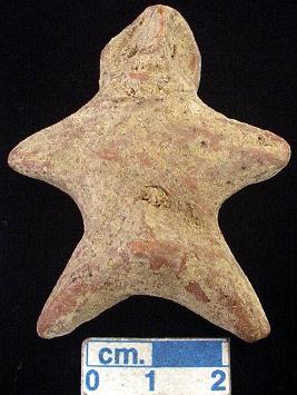 | Description / विवरण | An archaic terracotta human figurine with round head, red, pinched nose, pin hole eyes, slit mouth, short out stretched arms with one incised line on each, punched navel, short wide bridged stumpy legs, phallus indicated, treated with red wash, handmade. |
