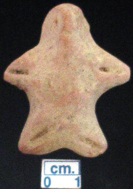 | Description / विवरण | An archaic terracotta human figurine with round head, red, pinched nose, pin hole eyes, slit mouth, short out stretched arms with one incised line in each, shrot wide bridged stumpy legs with one incised line in each, treated with red wash, handmade. |