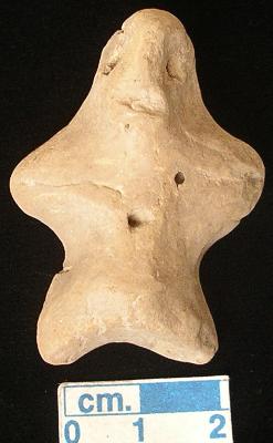 | Description / विवरण | An archaic human terracotta figurine, red, pinched nose, short out stretched arm, , short wide bridged stumpy legs, punched eyes, punched navel, handmade. |
