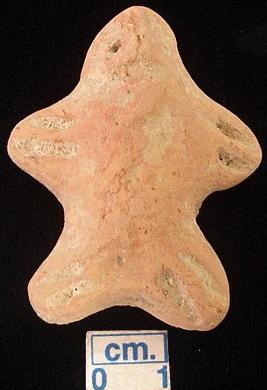 | Description / विवरण | A terracotta archaic human figurine with round head, red, pinched nose, slit mouth, pin hole eyes, short out stretched arms with two incised lines on each, short wide bridged stumpy legs with two incised lines on each, treated with red wash, handmade. |