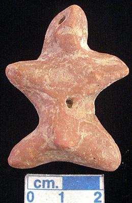 | Description / विवरण | An archaic terracotta male figurine with round head, red, pinched nose, punched eyes, slit mouth, short out stretched arms, punched navel, short wide bridged stumpy legs, phallus indicated, treated with red wash, handmade. |