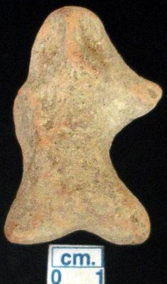 | Description / विवरण | An archaic terracotta human figurine with round head, red, pinched nose, pin hole eyes, slit mouth, short out stretched arms and right one is broken, shrot wide bridged stumpy legs, treated with red wash, handmade. |