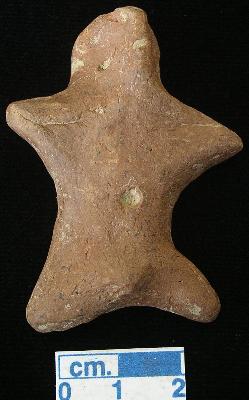 | Description / विवरण | An archaic human terracotta male figurine with round head , red, pin hole eyes, pinched nose and mouth, short out stretched arms, punched navel, short wide bridged stumpy legs, phallus indicated, blackish due to over firing, handmade. |