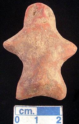| Description / विवरण | A terracotta archaic human figurine with round head, red, pin hole eyes, pinched nose, open slit mouth, short out stretched arms, short bridged stumpy legs, phallus indicated, treatment with red wash, handmade. |