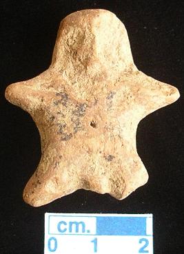| Description / विवरण | A terracotta archaic human figurine , pin hole eyes, damaged pinched nose , short out stretched arms, pin hole navel, short bridged stumpy legs but the left one is broken, devoid of any surface treatment, handmade. |