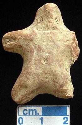 | Description / विवरण | An small archaic human terracotta figurine, red, pinched nose, slit mouth, short out stretched arms and left one is damaged, short wide bridged stumpy legs, punched eyes, punched navel, handmade. |