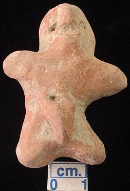 | Description / विवरण | A terracotta archaic male figurine, red in colour, pin hole eyes, pinched nose, slit mouth, short arms, short wide bridged stumpy legs but the right one is damaged, phallus indicated , treated with red wash, handmade. |